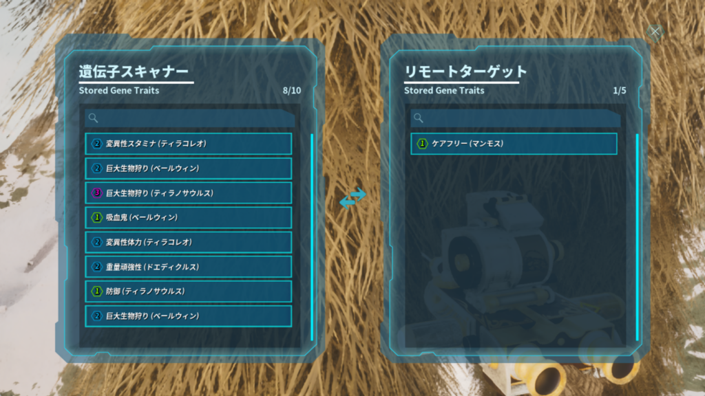 - 遺伝子スキャナーを装備した状態で Rキーを長押し
